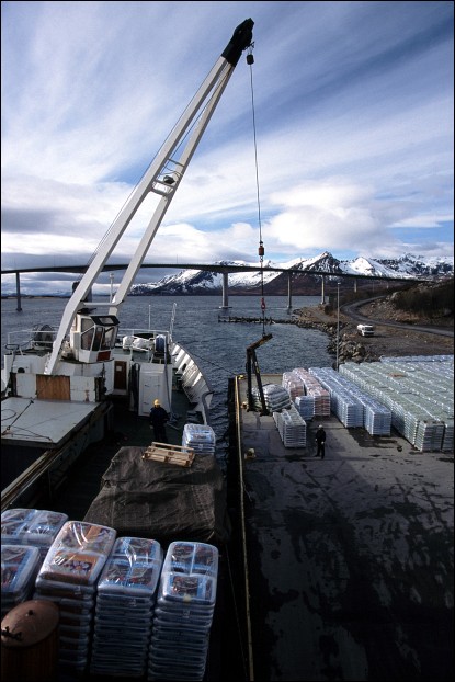 Risøyhamn. Chargement de sacs de tourbe.