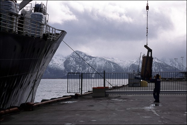 Sortland. Déchargement d'un chauffe-eau.